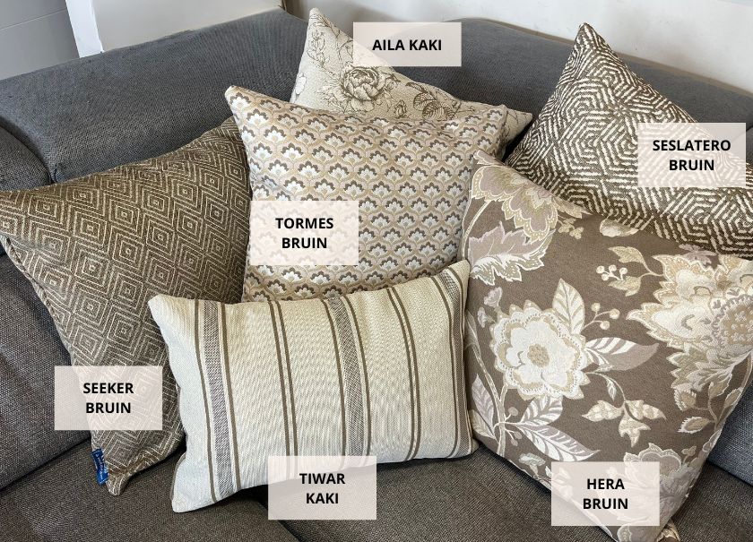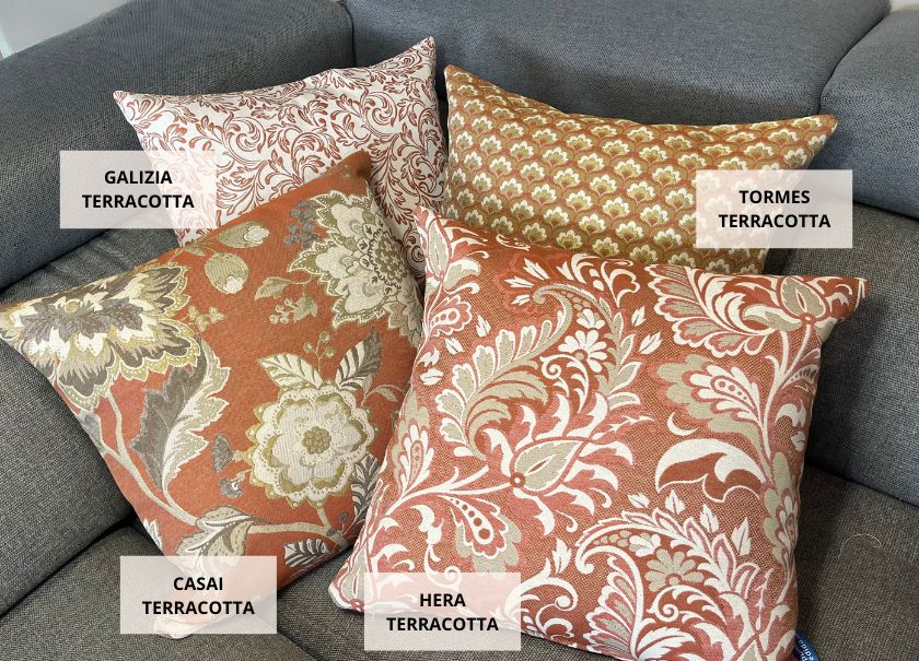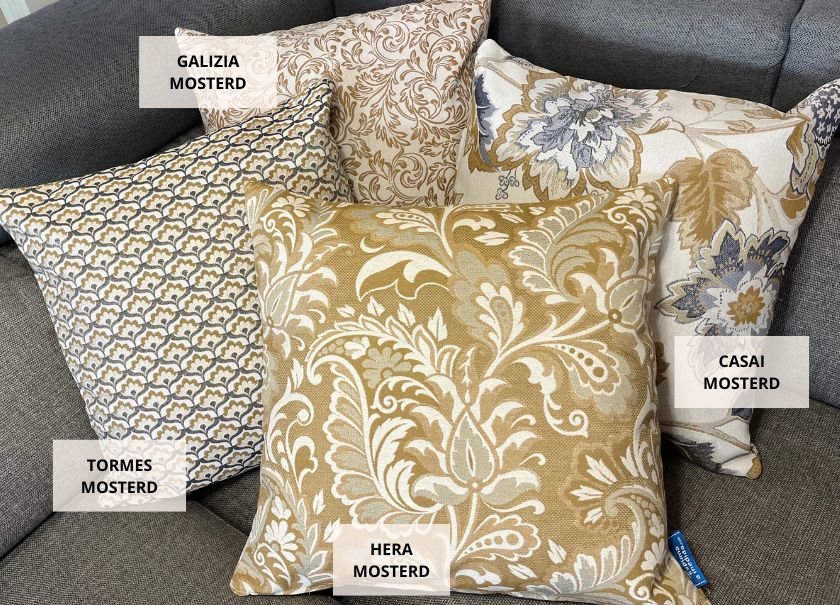 Bloemenprints en jacquards in aardetinten, oker en bordeaux worden harmonieus gecombineerd met effen en semi-effene stoffen, waardoor een verfijnde en gezellige sfeer ontstaat.